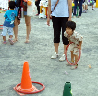 先生達の手作りであろうワラビ餅やら冷やしパインやら的当てやらが並ぶなかおにいちゃんが見せ場をつくったのがこちらの輪投げ。