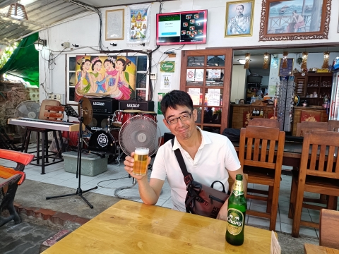 旅の初日から食で冒険する訳にもいかず流石にコチラはスルーさせて頂きましたが、通りの一角にある食堂にて揚げ春巻きをアテにタイビールの代表格「チャーン」で乾杯。