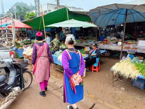 この衣装は多分「リス族」の方々と思いますが、独自の色彩センスに自信があるというリス族は普段着として民族衣装を来てくれてるので、お陰様で山岳民族目当てに来たコチラも見る甲斐ありですな。
