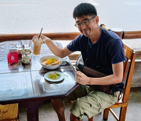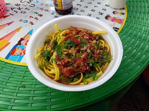 せっかくなので、朝市の中の麵屋さんで名前は分かりませんが黄色い麺に辛そうな肉の餡と香草をたっぷり乗せた麺を朝食で頂きです。