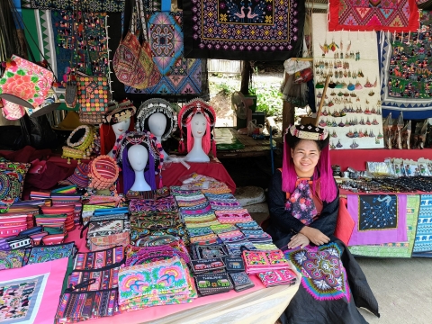 村を一回りし民族衣装を着たモン族の方を探しますが残念ながら普段着の方しか見当たらず、仕方ないので民族衣装屋さんで自らが着てみることに。