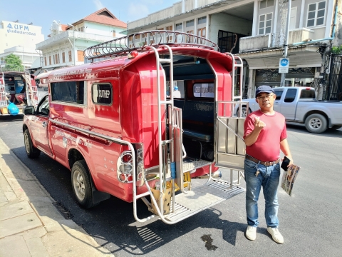 食後は大きな通りでソンテウのオッチャンと交渉し、夕方まで行きたい所を3か所回って1,000バーツ(約4,400円)で交渉成立し、本日はコレに乗って観光へGO!!