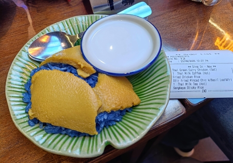 お昼自体はグリーンカレーやらガパオ・ライスやらいつものメニューでしたが、食後用に本日のターゲットである黄色と青のコントラストで映え間違い無しの「バタフライピーを使った青いもち米を使ったマンゴースティッキーライス」を注文。。。も、売り切れてたので(怒)代わりにコチラにトライです。