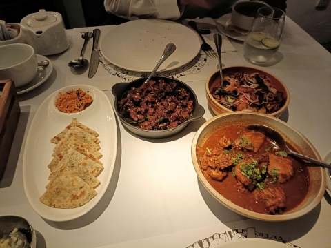 前菜でディップソース付のチップスを食べた後、メインは(左から)「ロティ」「羊肉の炒め物」「チキンカレー」「ナスのサラダ」が出てきましたが、どれも上品で美味い!・・・けど、如何せん全部辛い。