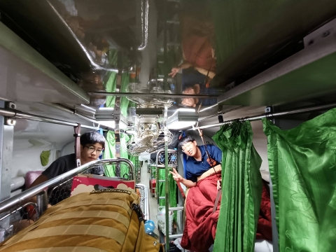 車内は日の高い内は普通の座席で、買い込んだ駅弁や途中駅で乗り込んでくる物売りから串焼き&もち米を買って食べたりしてましたが、7時前になると係員さんがやってきて椅子をベッドに変形させシーツやら枕やらをセットしてくれ、あっと言う間に寝台ベッドに早変わり。