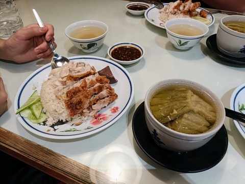 ゆっくり朝ごはんを食べたりワット・プラケオまで歩いて来たりとスローペースだった為、前回行きそびれた「ワット・ポー」に又しても行きそびれましたが、夕方の列車の時間もあるのでホテルをチェックアウトしてから友人の息子の希望に沿い「ピンクのカオマンガイ屋=ゴーアン カオマンガイ プラトゥーナム」の中華街のお店へ。