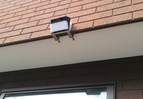 本来の仕様は壁にネジで固定する事になってますが、家の外壁に穴をあけるのが嫌だったので「未来工業 取付自在板 BPF-1712J」に取り付け、ステンレスのクランプで庇の出っ張りに挟み込んで設置。