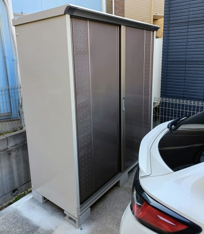 流石にもう家の中には大量のアウトドアグッズを逃がす場所など無いので、まだ少しスペースに余裕のある駐車場の隅っこに物置を設置です。